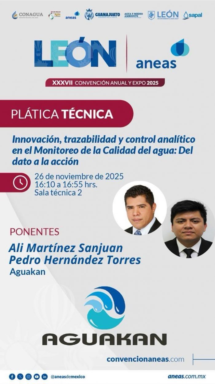 Aguakan dio un paso histórico al participar como ponente en la prestigiosa XXXVII Convención Anual y Expo ANEAS 2025, celebrada en León, Guanajuato. En este foro nacional del sector hídrico, Ali Martínez Sanjuan, gerente de aseguramiento de calidad, medio ambiente y seguridad industrial, junto con Pedro Hernández Torres, jefe de calidad, presentaron la ponencia “Innovación, trazabilidad y control analítico en el monitoreo de la calidad del agua: del dato a la acción”.