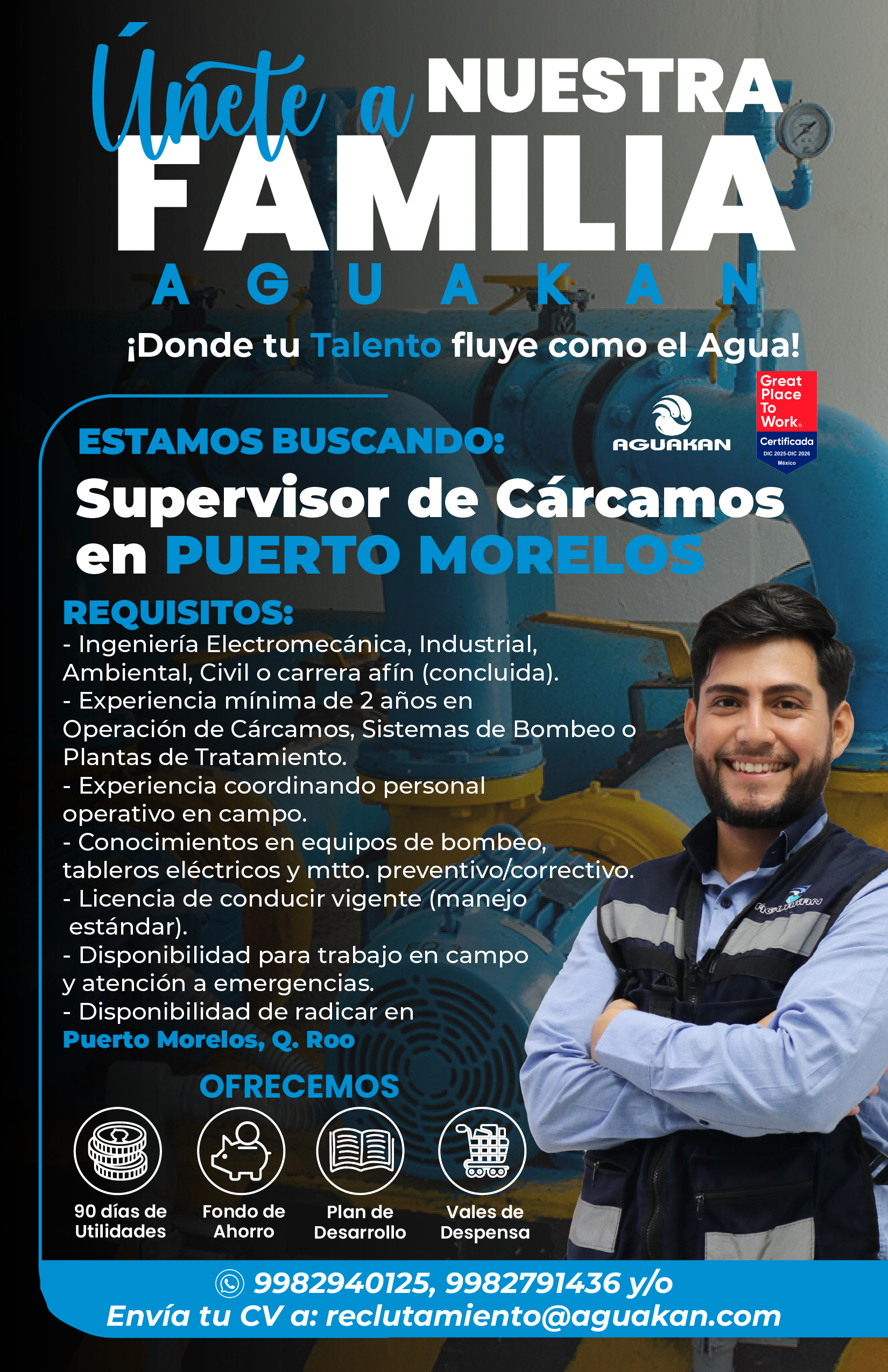 Buscamos Supervisor de Cárcamo para Puerto Morelos para asegurar la correcta operación de los sistemas de bombeo y la continuidad del servicio.